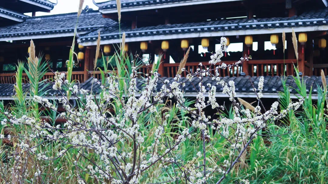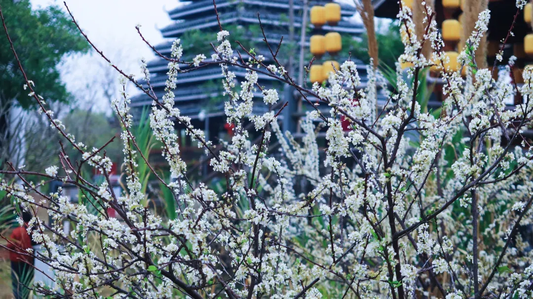 这就是毗邻广西民族博物馆的广西民族村!十几株李花悄然盛放,素白的花瓣簇拥枝头,清雅如雪,与村内的风雨桥、鼓楼、青砖黛瓦相映成趣。