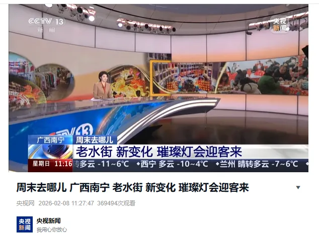 2026年2月8日,央视新闻客户端发布内容——周末去哪儿 广西南宁 老水街 新变化 璀璨灯会迎客来