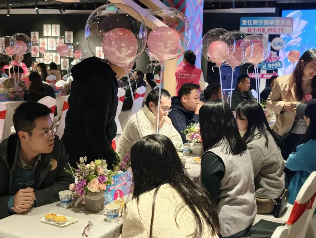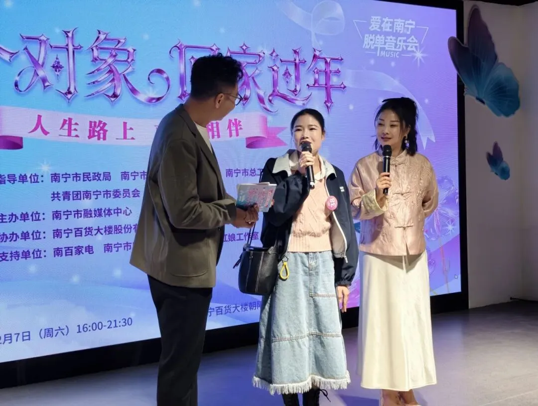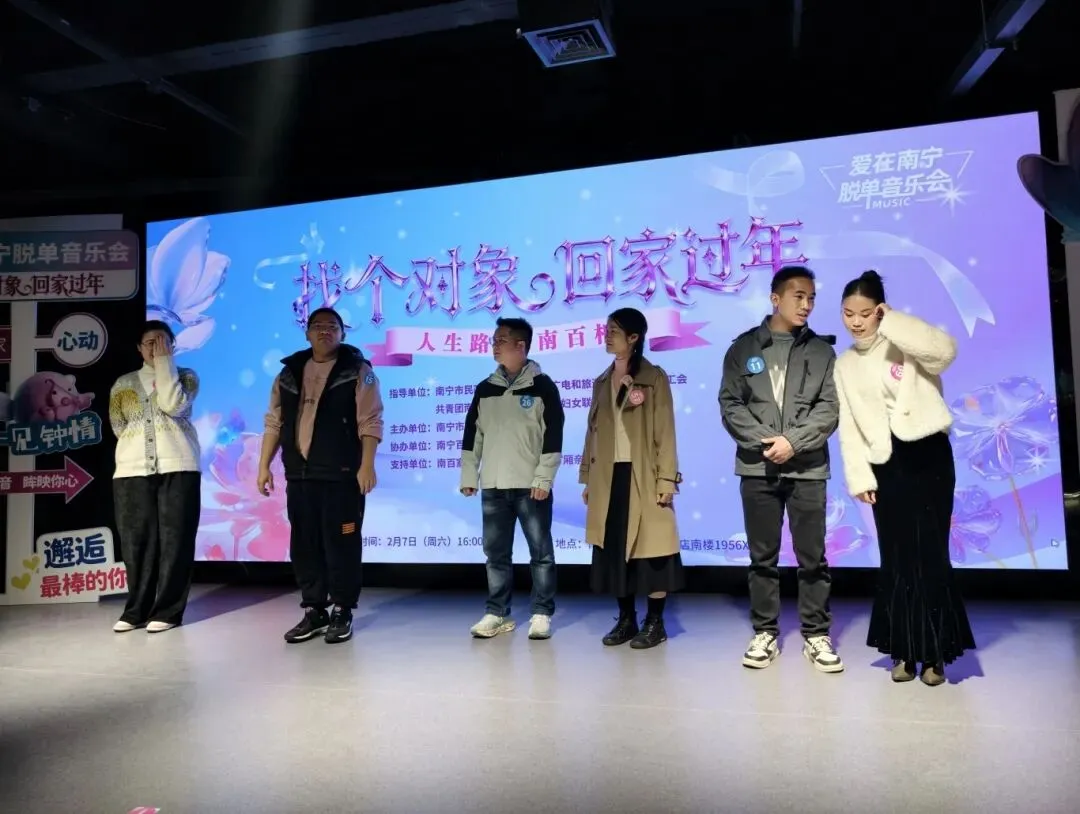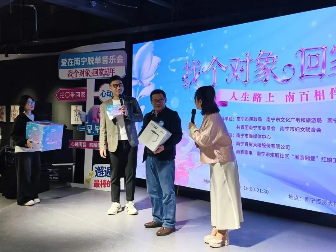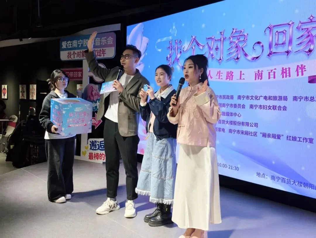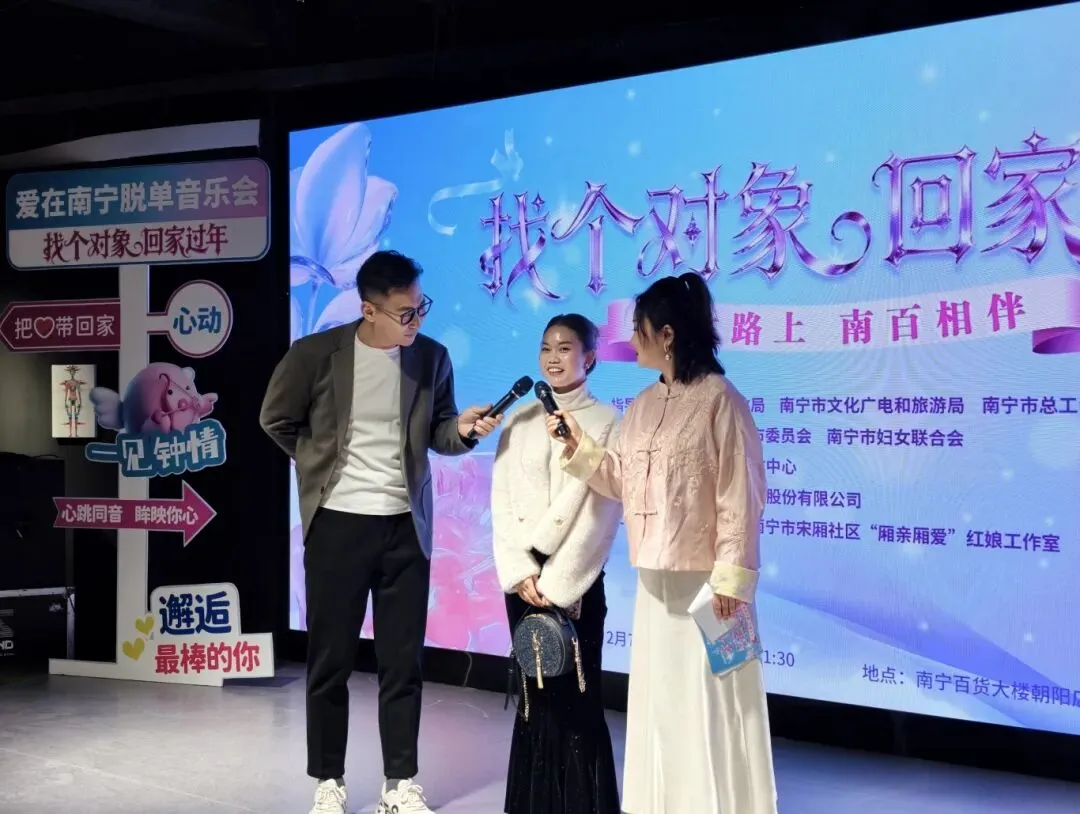 2月7日下午,“爱在南宁·脱单音乐会——找个对象回家过年”公益交友活动在南宁百货大楼浪漫启幕。本次活动由南宁市民政局、南宁市文化广电和旅游局、南宁市总工会、共青团南宁市委员会、南宁市妇女联合会共同指导,南宁市融媒体中心主办,南宁百货大楼股份有限公司、良庆区宋厢社区“厢”亲相爱红娘连线工作室协办,为全市120名青年打造了一场有温度、有趣味、有诚意的公益交友盛会。