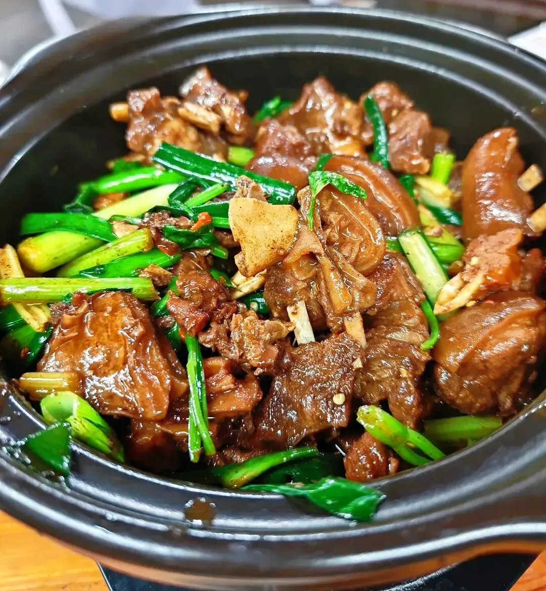 第一道必须点的是这里的招牌羊肉干锅。黑砂锅里的羊肉块焖得油光锃亮的,每一块都裹着浓稠的酱汁,葱段在高温里爆得非常翠绿。