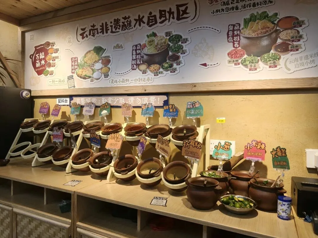 看着招牌上五色俱全、里面挤满各种食材的土陶罐。还有各种各样的蘸料,让人食欲倍增。