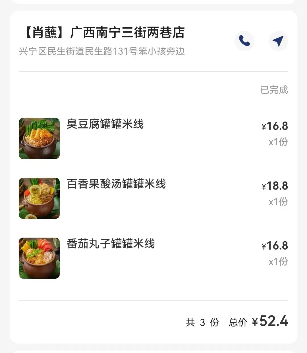 我们扫码下单一份臭豆腐罐罐米线,一份百香果酸汤罐罐米线。一份番茄丸子罐罐米线。一共52块4毛,价格亲民。