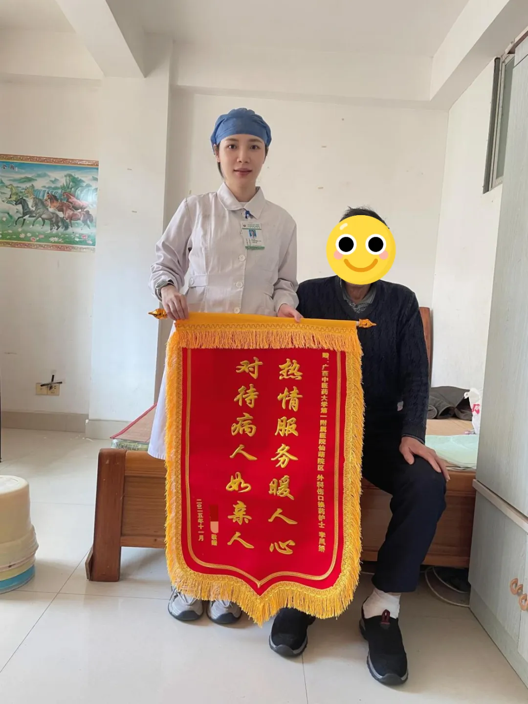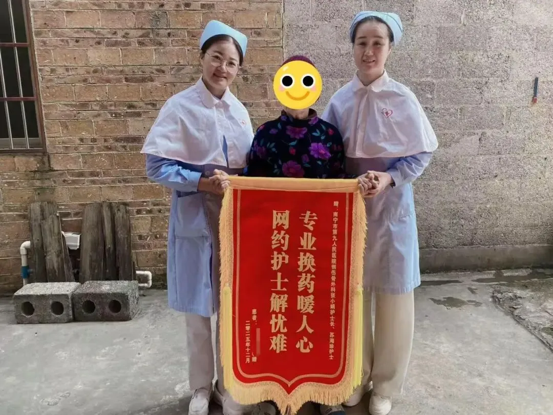 2025年6月,钟奶奶不慎从床上摔下,导致股骨颈骨折。术后回家休养,隔天换药成了难题。韦明弟再次主动承担起上门换药的任务。随后几次上门,他不仅精心为奶奶清洗、包扎伤口,还耐心指导家属如何协助老人康复活动。在他的细致照护下,伤口愈合得平稳而顺利。