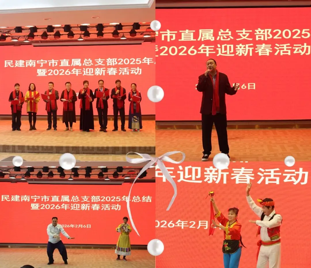 2026年2月6日上午,直属总支在银河大酒店开展了2025年总结暨2026年迎新春活动,市委梁满红主委、专职副主委梁勇参加活动,同时参加活动的嘉宾有各总支主委。总结会上直属总支宁洪晖主委做了2025年工作总结报告,并提出了2026年总支的工作思路。梁满红主委带来了市委的深情祝福! 总结会后,直属会员进行了精彩的文艺表演:开篇的诗朗诵《中华颂》,深刻表达了我们的家国情怀;江南总支李直主委的一首《跟往事干杯》,如老友般的问候,带来了共情;会员李娟葫芦丝独奏与郑文武的太极拳表演,形意相融,呈现出从容、内敛的东方意境;会员黄跃的舞蹈《绣球传情》,让我们欣赏了广西壮族歌仙刘三姐的含蓄浪漫;会员王丹的独舞,带我们漫游了美丽的北极风光;会员钟江平的一碗《门前情思大碗茶》,表演氛围直接拉满;最后全体会员的大合唱《我和我的祖国》把整场活动氛围推向高潮。相聚的欢乐、节日的祥和都在这大家庭似的聚会中得以体现! 此次活动共有100多名会员参加,市委专门对七十岁以上的老会员发放了慰问品,体现了民建对老会员的关怀;文化委陈湘东、玉文君两位老师在现场专门为会员进行了书法表演,免费赠送春联、“福”字,让会员们提前感受到中国传统年的暖意,深得会员们的欢迎;此次活动,得到民建兴宁总支会员、银河大酒店邓志中副总经理以及民建青秀总支会员、美丹泉(广西)文化传媒集团有限公司王晨更董事长的大力支持!