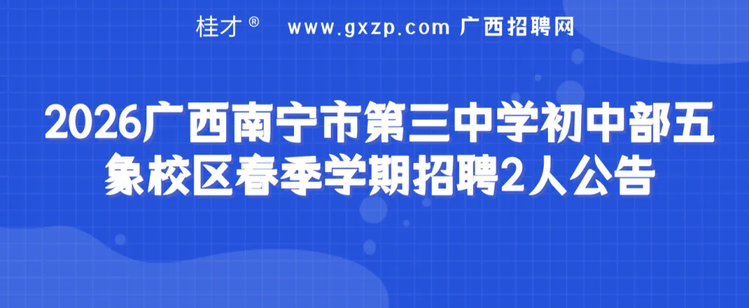 南宁市第三中学初中部五象校区是南宁市第三中学教育集团的分校区,于2017年9月招生办学。校区位于南宁市良庆区坛兴路32号,校园环境优美,教学设施设备完整先进。根据工作需要,南宁市第三中学初中部五象校区2026年春季学期计划招聘初中学段临聘教师。现将有关事项公告如下: