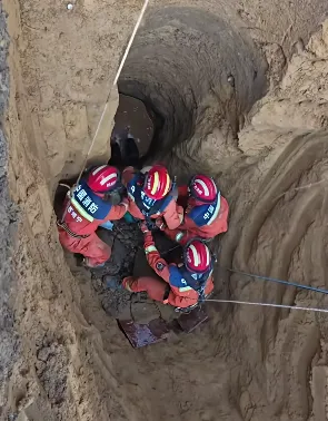 消防救援人员首先尝试牵引救援,但因被困人员埋压过深未能成功。当即调整为保守救援方案;持续输送新鲜空气与葡萄糖水维系其生命体征,同步小心清理体表沙土,期间两次遭遇沙土回流;救援队伍迅速架设木板阻隔险情,随即启动“人力+机械”协同模式,自上而下破拆井壁侧面辅助挖掘,覆盖在被困人员身上的水泥板被成功清除,其上身恢复自由活动。