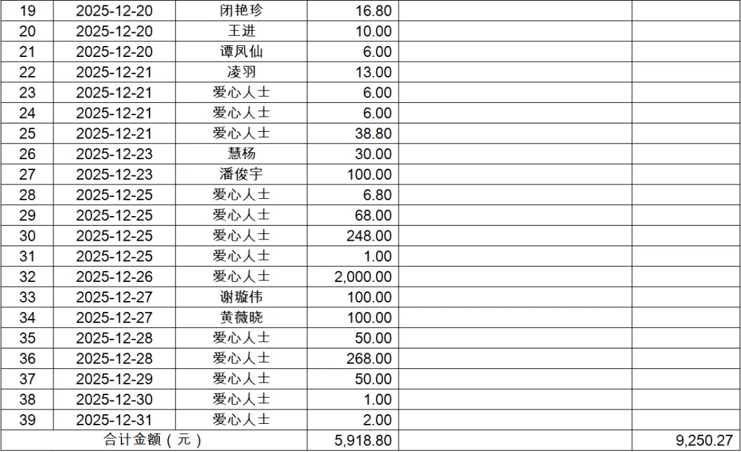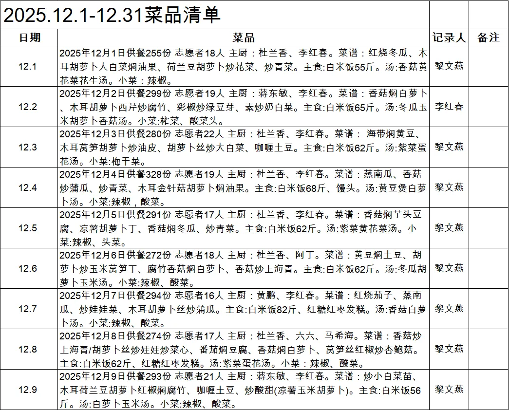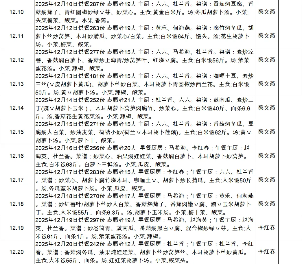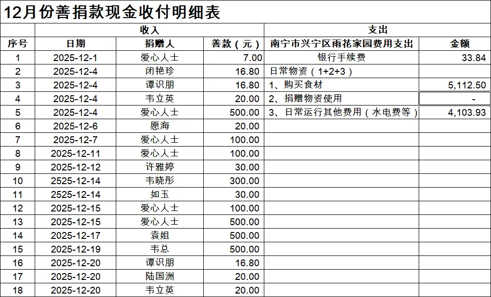 我们雨花家园素食餐厅红日山湖店,2025年3月18日开业,至今已有10个月,感谢大家一直以来对南宁市雨花斋公益慈善服务中心的关注与支持!我们始终致力于提供优质的服务,让长者们在晚年生活中感到温暖与关怀。为保持我们的工作透明、公正、公开,现特向大家公布2025年12月的财务数据。