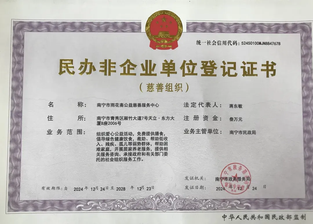 南宁市雨花斋公益慈善服务中心是2024年12月24日在南宁市政务服务局登记注册。批准成立的民办非企业单位(统一社会信用代码:52450100MJN8847678),业务范围:组织爱心公益活动,免费提供膳食倡导绿色健康饮食救助帮助低收入残疾孤老等弱势群体帮助困难家庭开展居家养老服务等,业务主管单位是南宁市民政局,致力于为社区老人、困难群体提供免费素食餐饮服务,同时弘扬中华优秀传统文化,推动社会公益事业发展