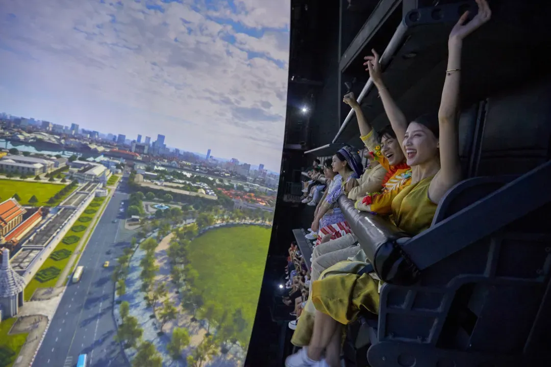 双腿悬空乘坐悬挂式动感座椅飞跃十国