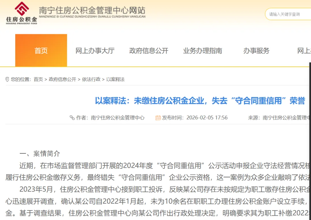 【南宁】以案释法:未缴住房公积金企业,失去“守合同重信用”荣誉