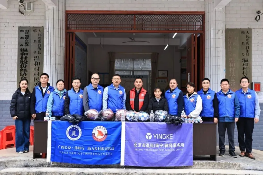 当日下午,团队继续前往温和村开展活动。在村委法律咨询点,律师们为村民提供面对面的法律服务。盈科南宁同时向村内小学捐赠体育用品,传递对乡村教育的支持。