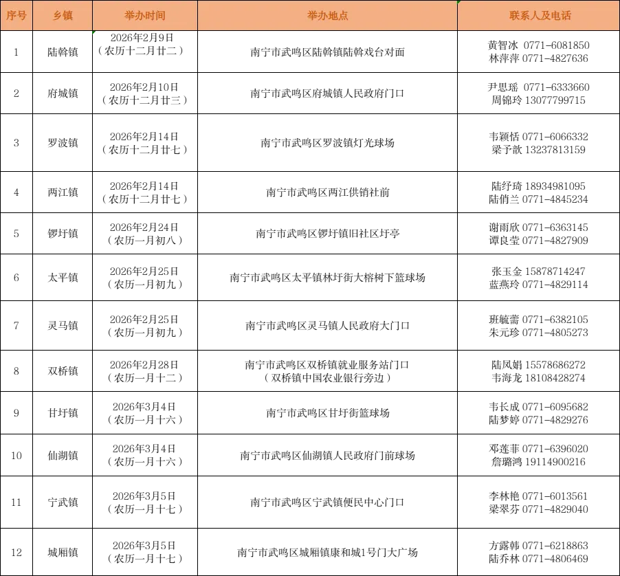 为有就业创业意愿的农村劳动力、就业困难群体以及有用工需求的用人单位搭建精准对接平台,提供全方位就业帮扶和用工服务,持续营造“就业有支持、用工有保障”的良好就业生态。定于2026年2月举行2026年南宁市武鸣区春风行动暨就业援助季活动“就业暖心·桂在行动”专场招聘会。