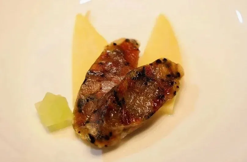 巴马香猪的丰腴与深海鱼子酱的鲜爽,演绎一场高端食材的跨界对话。香猪经慢烤至外皮金脆酥香,内里肉质细嫩多汁,点缀的鱼子酱爆浆迸发咸鲜,油脂香气与海洋风味在口中交织,尽显创意巧思。