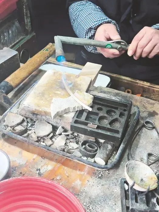 非遗匠人用喷火器加热银条 周小燕 摄