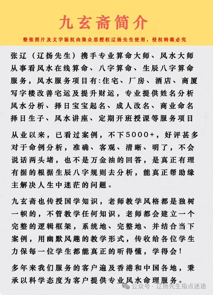 张辽(辽扬先生)专业从事看风水在线算命、八字算命、生辰八字算命服务,风水服务项目有:住宅、厂房、酒店、商厦、写字楼改善宅运及提升财运,专业提供姓名分析、风水分析、择日宝宝起名、成人改名、商业命名、择日生子、风水讲座、定期开班授课等服务项目。