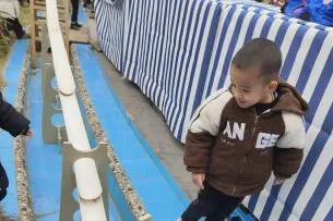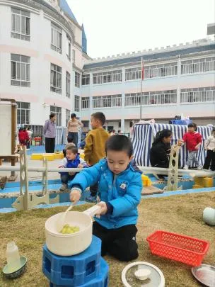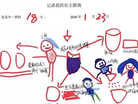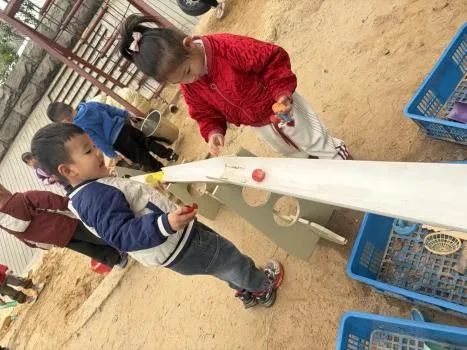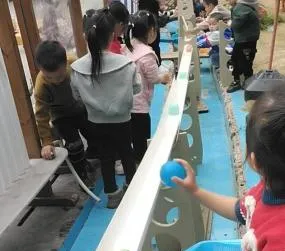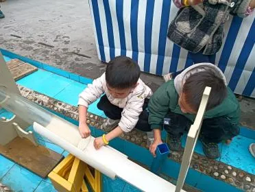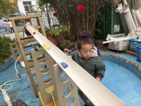 难题解决后,幼儿自主开启《竞速游戏》,结合第一次滚物漂流的体验,自发升级为竞速玩法:取来自备的纸船、瓶盖等物品,自主放置、观察差异,还制定竞速规则。从基础探索到自主升级搭建、独立破题、设计玩法,游戏持续深化。