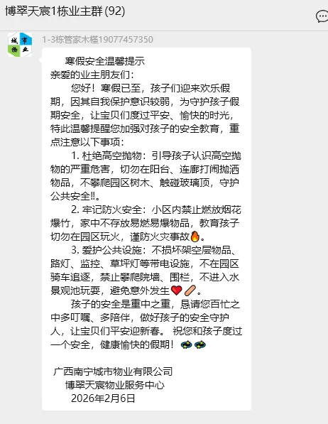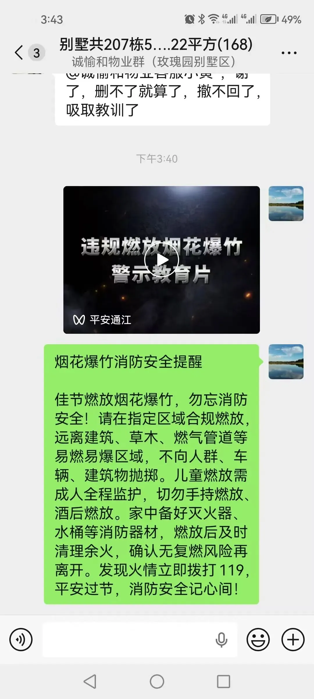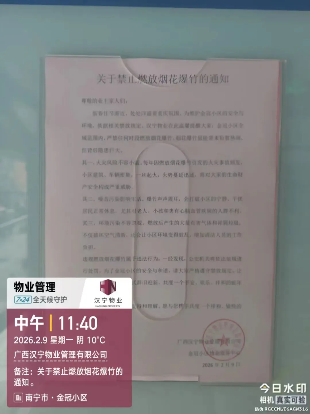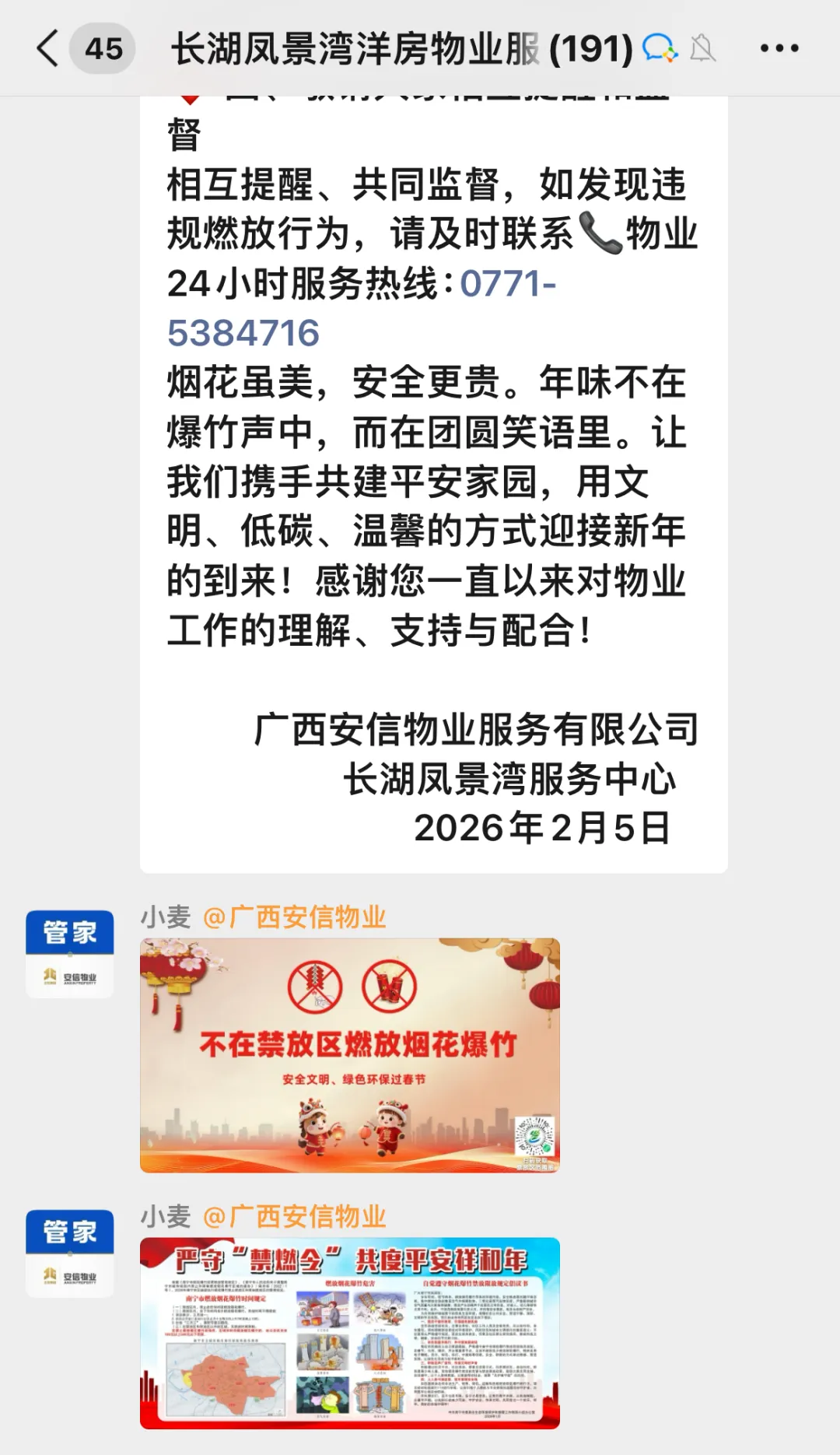 在金冠小区、锦绣小区等项目,广泛张贴禁止燃放烟花爆竹的通知,并在业主群发布相关安全提醒。