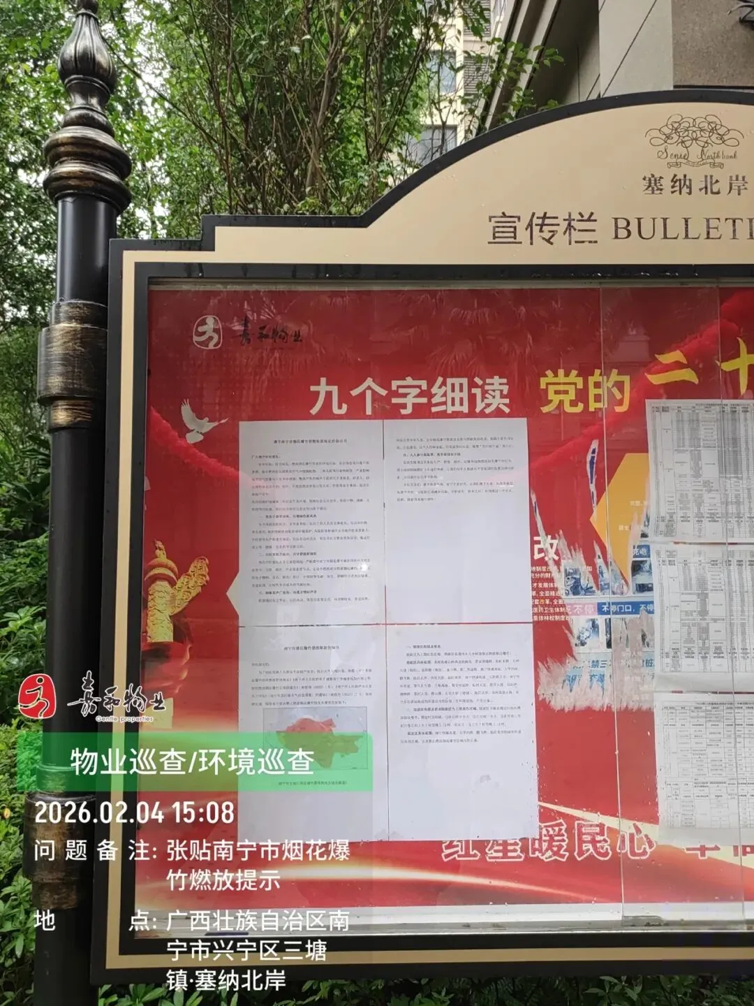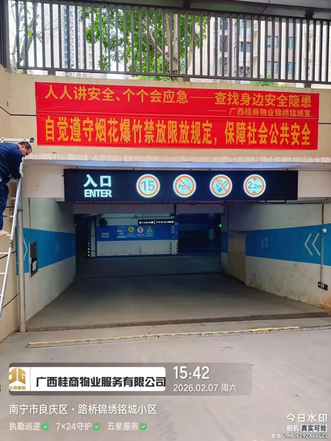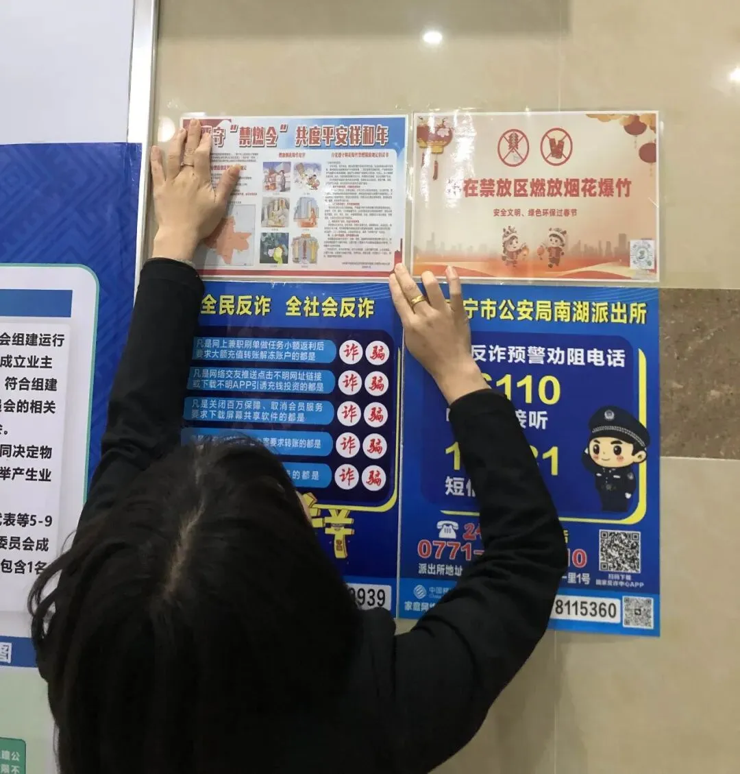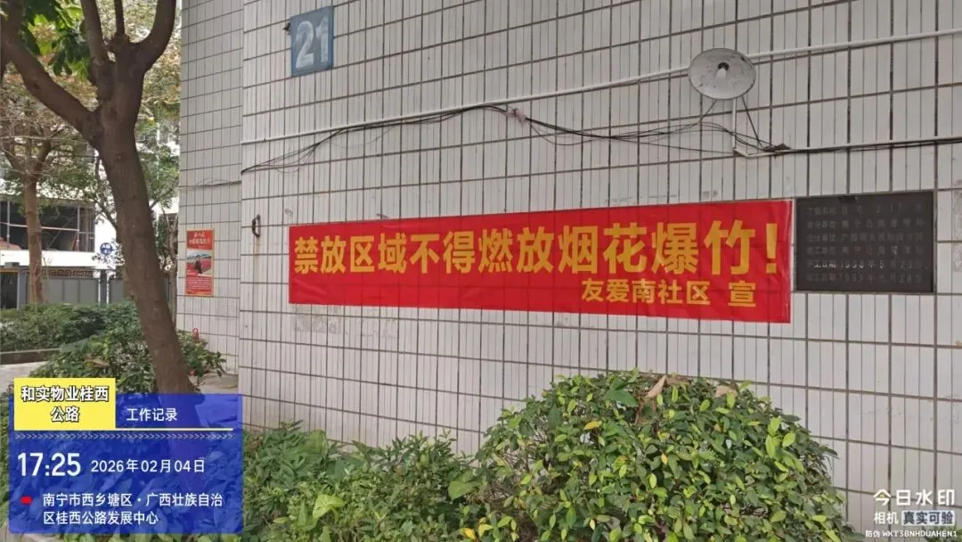 新春佳节将至,为严格落实烟花爆竹禁燃限放管控要求,切实保障人民群众生命财产安全和全市环境空气质量稳定达标,南宁物业行业积极开展宣传引导工作,提升广大业主的安全意识和法治观念,全力营造绿色文明、平安和谐的节日氛围。