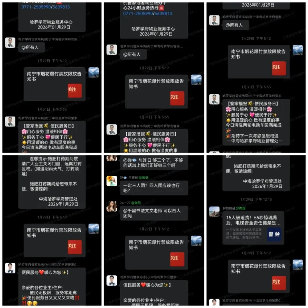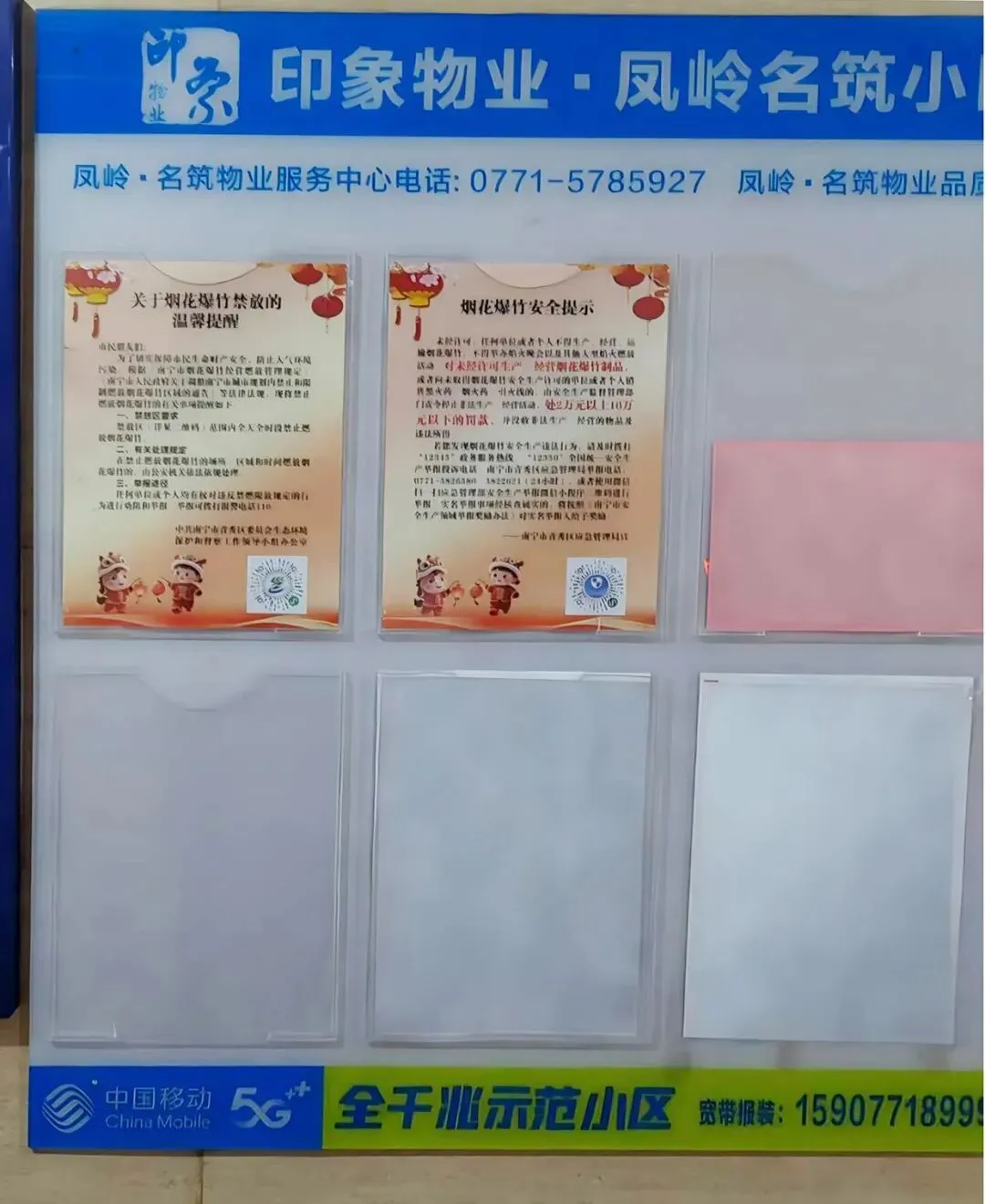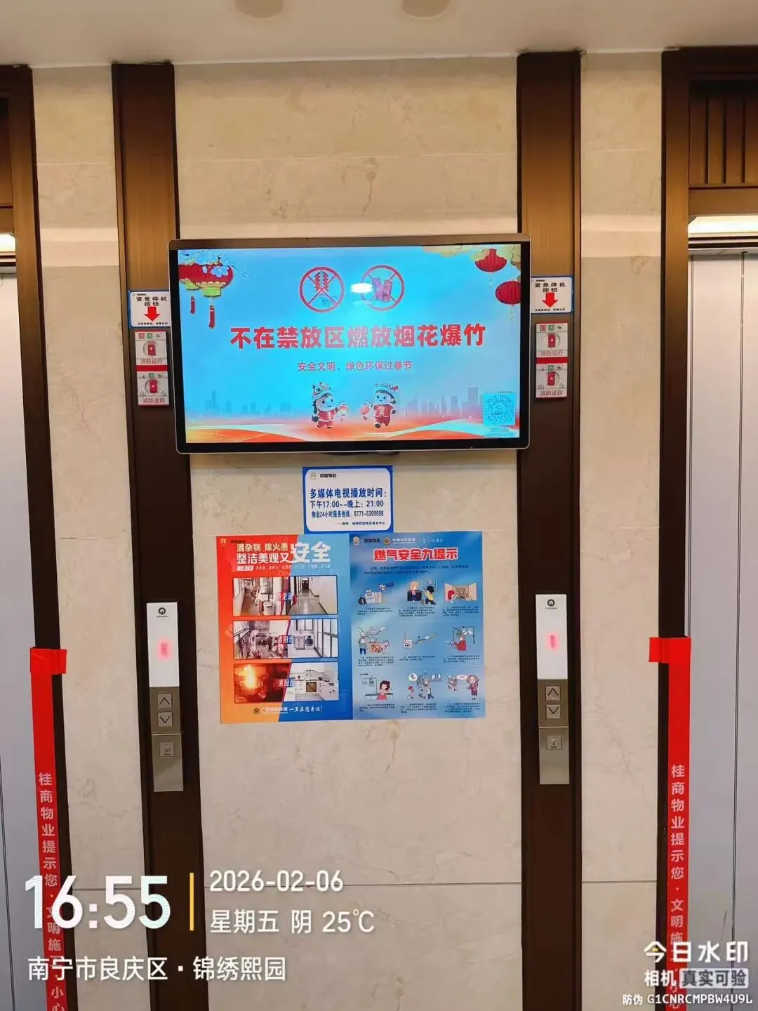 通过小区业主微信群、楼栋门厅显示屏等多个渠道,积极宣传《南宁市烟花爆竹禁放限放告知书》及相关宣传海报。