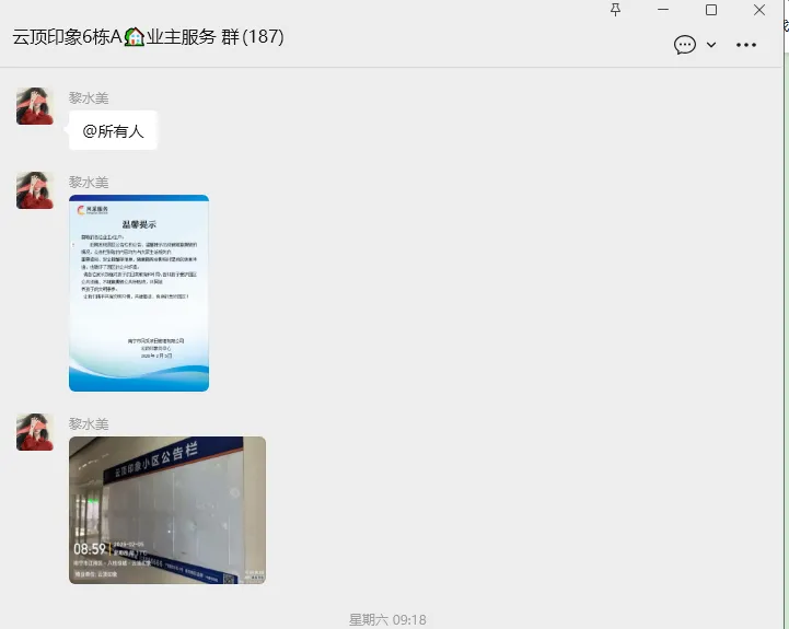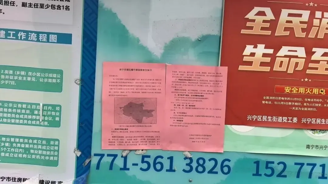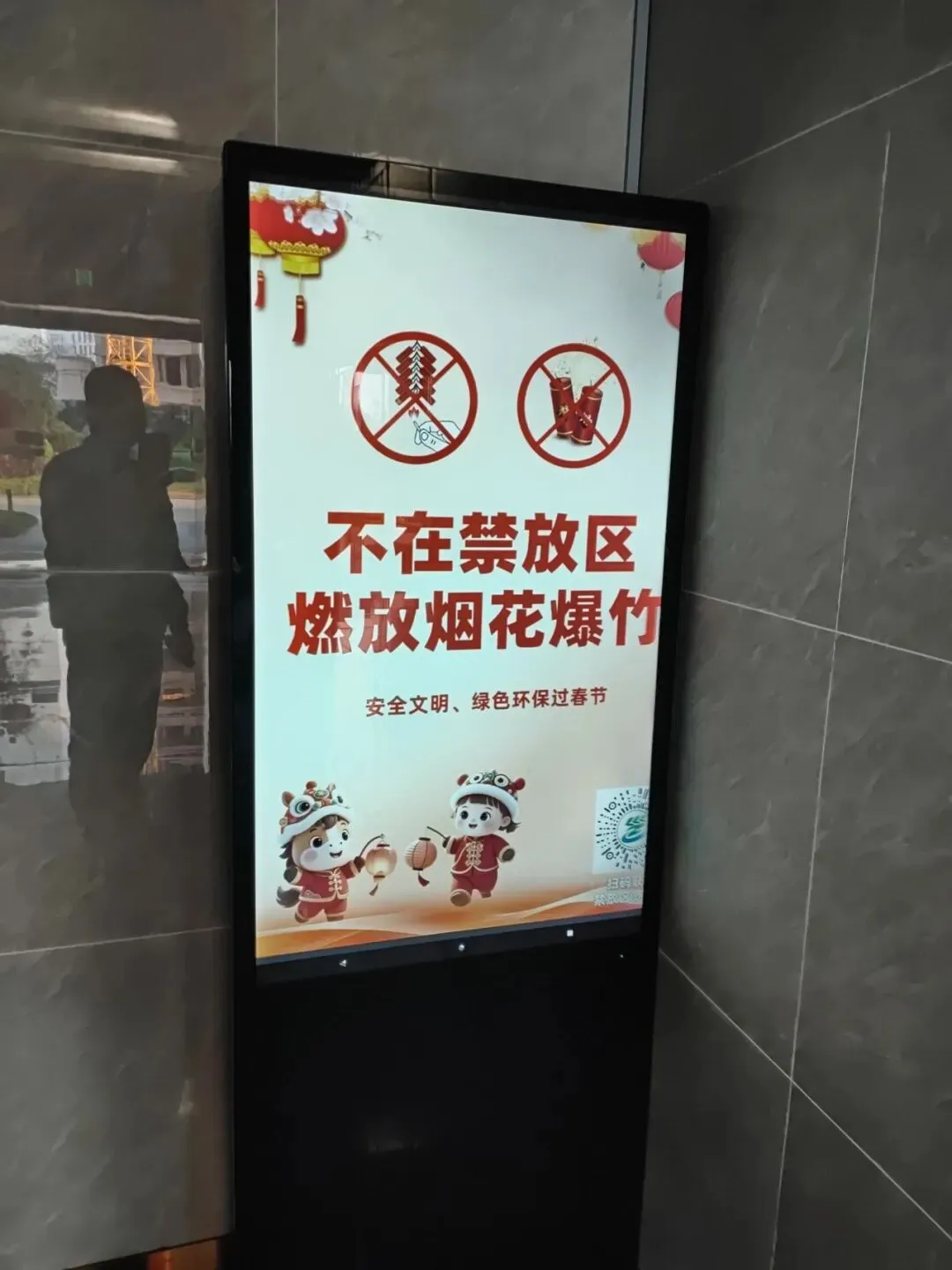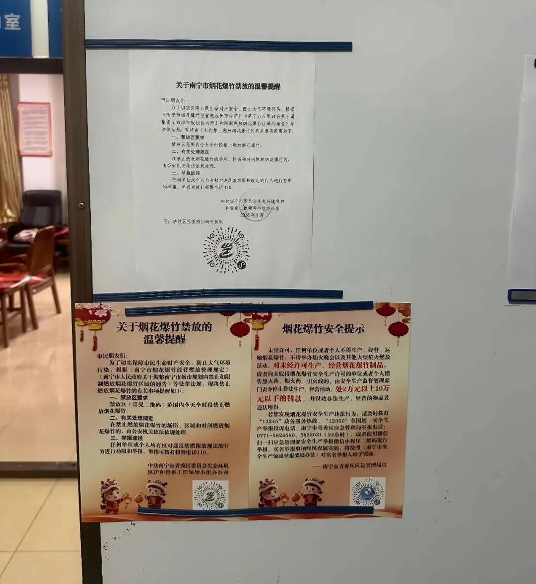 通过小区业主微信群、楼栋门厅显示屏等多个渠道,积极宣传《南宁市烟花爆竹禁放限放告知书》及相关宣传海报。