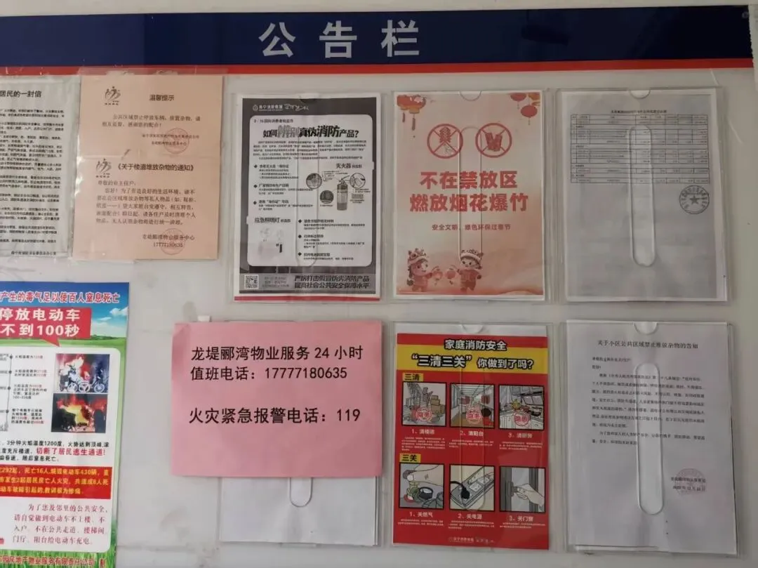 在小区公告栏、入户门、楼栋门厅等显眼位置,广泛张贴烟花爆竹禁放限放海报和宣传标语,并在业主群发布防火知识视频等。