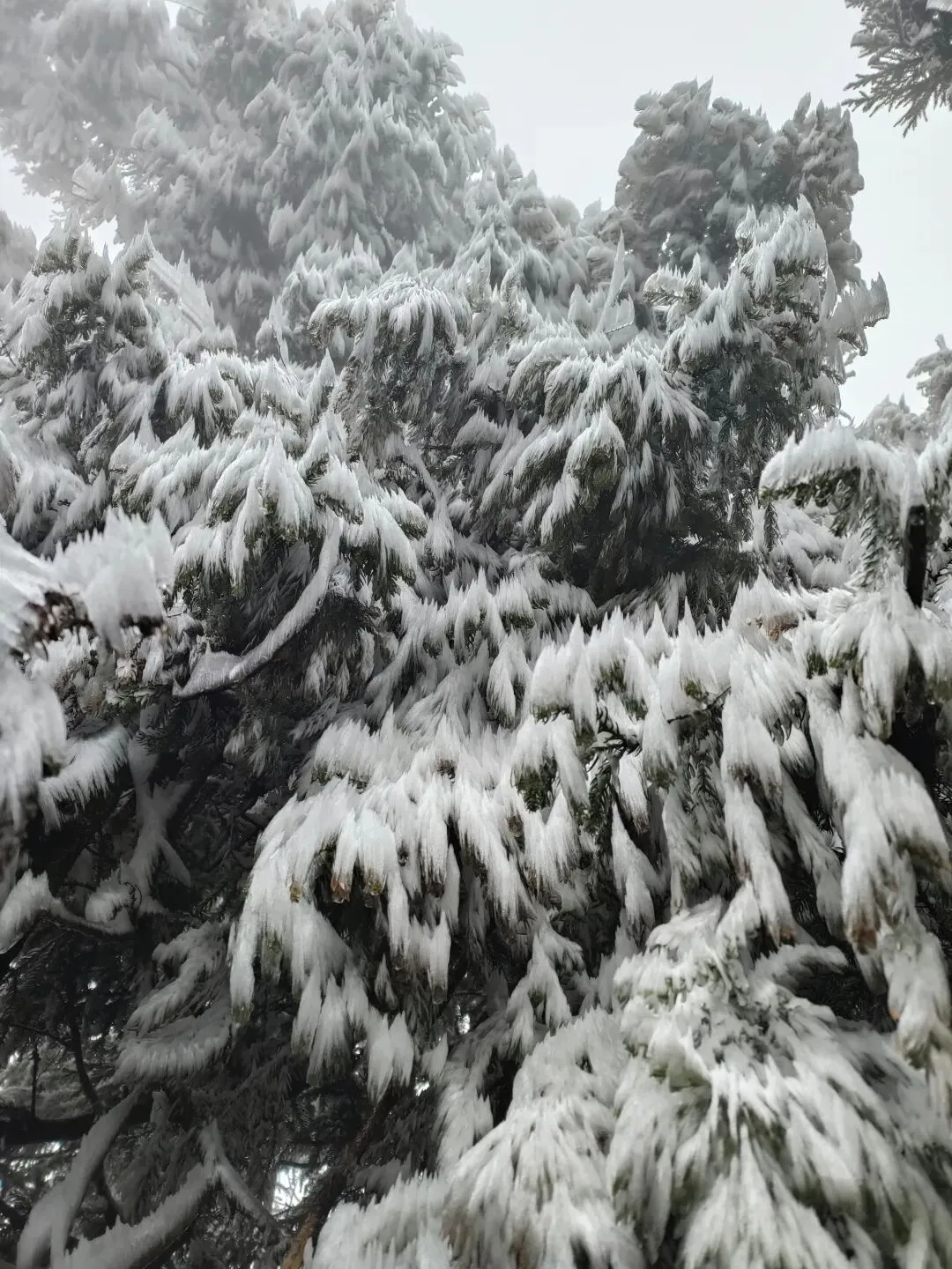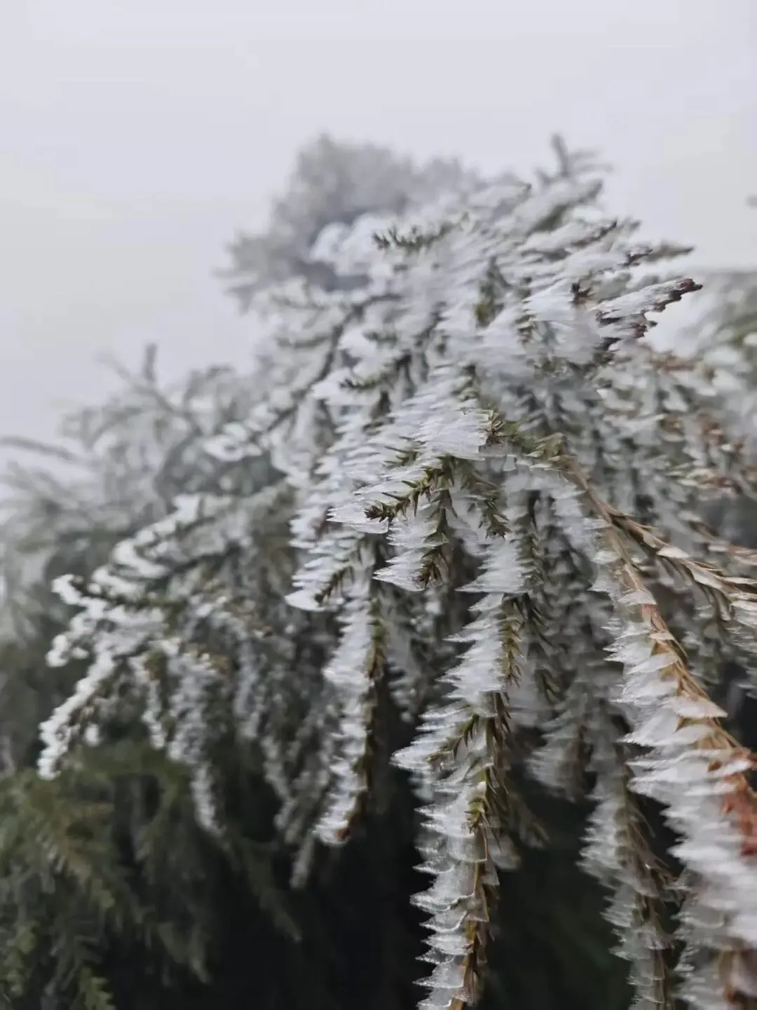 自南天门到山顶一段水汽充足,雾气很足,能见度只有二三十米,格外冷,不戴手套的话,拍几张照时间手指就可以被冻僵。等到了最高点祝融峰,山顶的大风夹着雾汽扫过来,迎风坡的树枝上都披上了厚厚的白白的雾凇。没想到山下是干爽的阴天,在抛开见雾凇的念想后还能如愿见到雾凇,这简直是意外之喜。这一刻只觉得所有上山的辛苦都不值一提。
