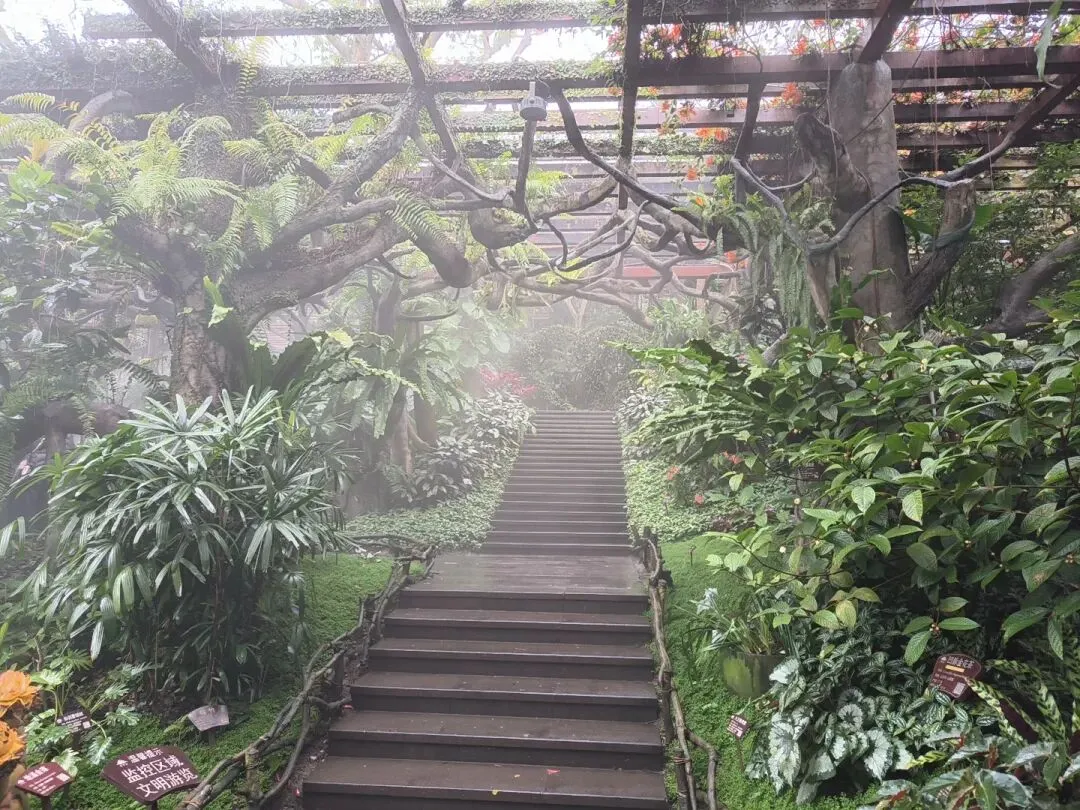 游览从萌生植物园开始。一入园,烟雾缭绕,如入画中仙境。小径两旁,盘根错节的树木静立相迎,仿佛向远道而来的旅人颔首致意。许多不知名的花草在氤氲水汽中轻轻摇曳,姿态万千。行走其间,尘世喧嚣似被悄然滤去,只觉心神明澈——那一刻,我们看见的,是褪去浮华后澄净如初的自己。