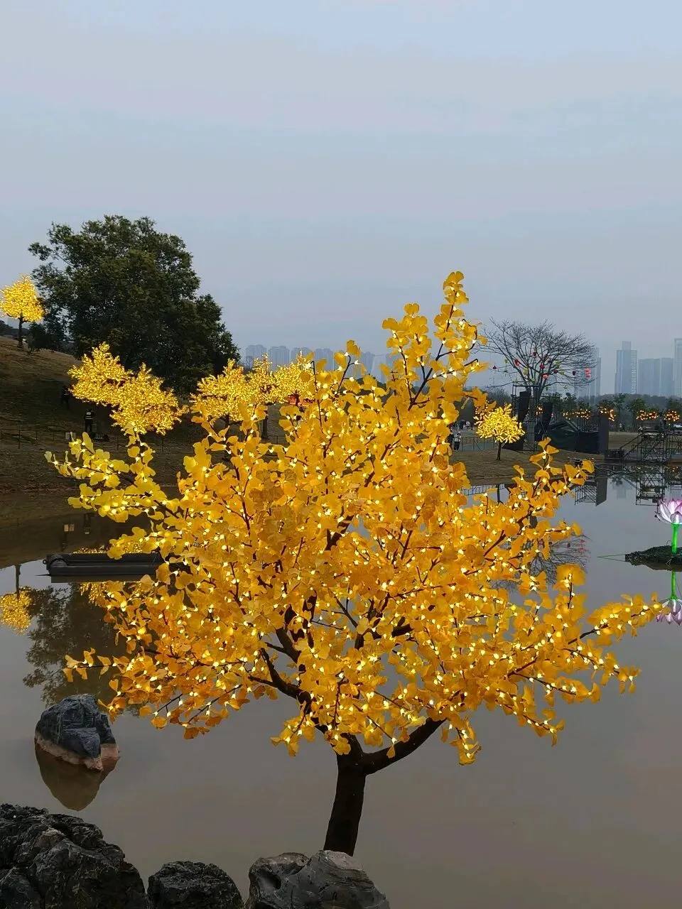 随后沿小径返回,至音乐草坪盼一场演出。草坪尽头有土坡,坡上黄桷树枝叶舒展,郁郁苍苍,静立于天地之间。我们在此小憩,简单用了炒饭与木薯糖水,待到五点半,却得知当晚并无演出安排,便转往东门观赏灯会。