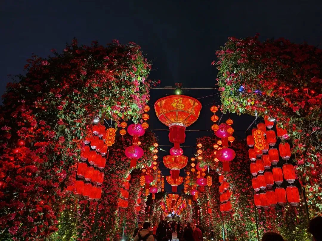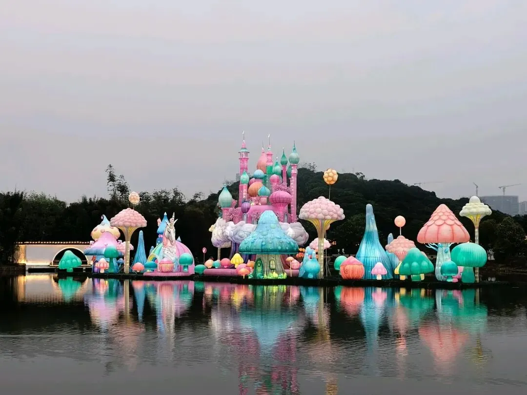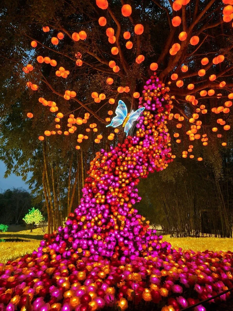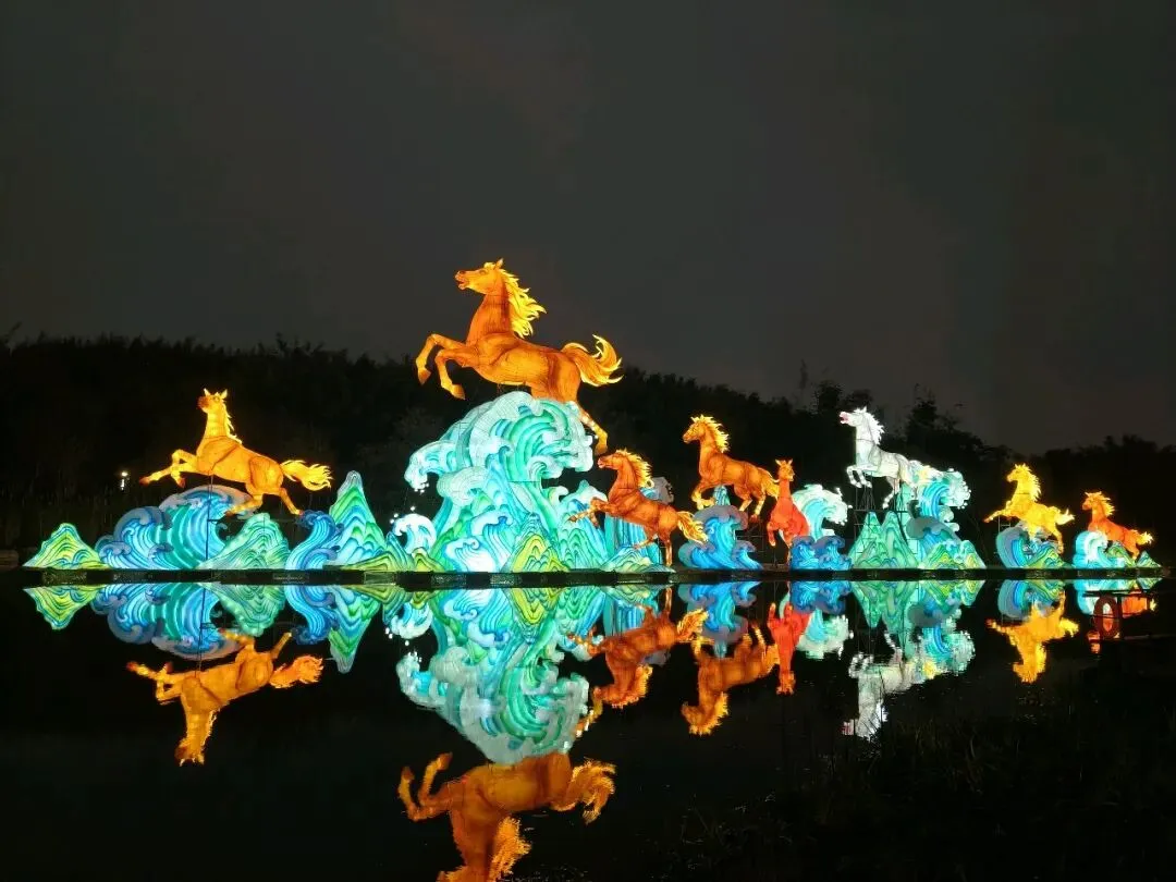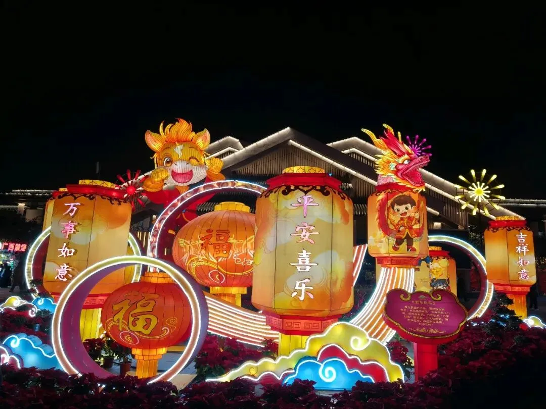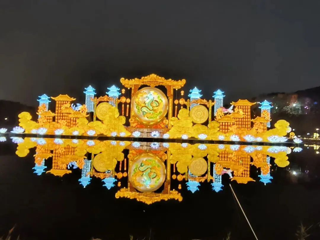 暮色渐合,山灯初上。主路两侧,灯光造型次第点亮:凤凰于飞、双龙戏珠、招财进宝、动漫魔法、策马奔腾……还有各式花果、字形灯饰缀于竹林,光影交错,立体流转。整条山路流光溢彩,真可谓“火树银花不夜天”,让人目眩神驰。