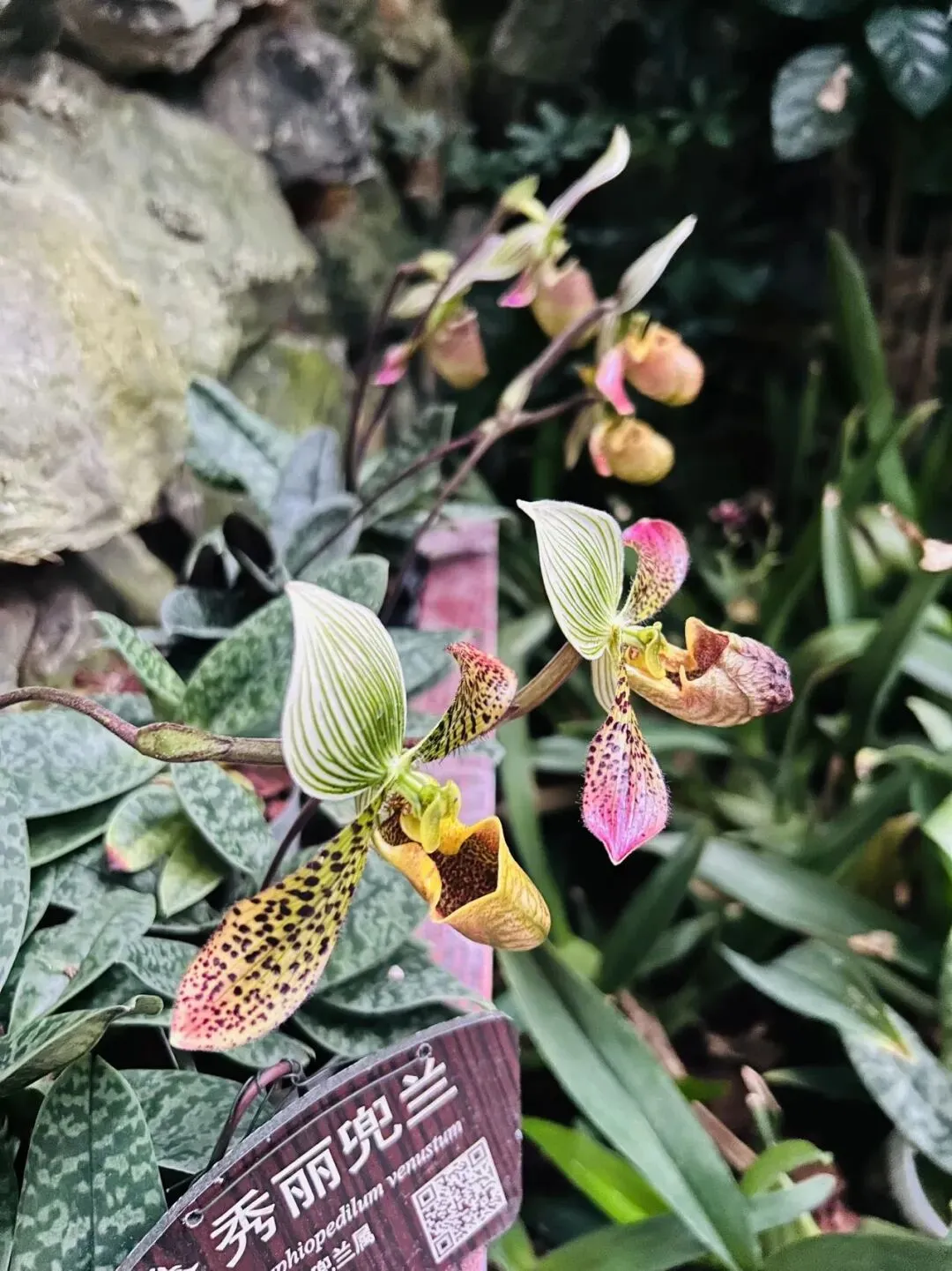 接着看到了各种各样的兰花,最有趣的是兜兰,其唇瓣部分像个鼓起来的口袋,吸引昆虫去口袋部分采集花粉进而完成授粉。