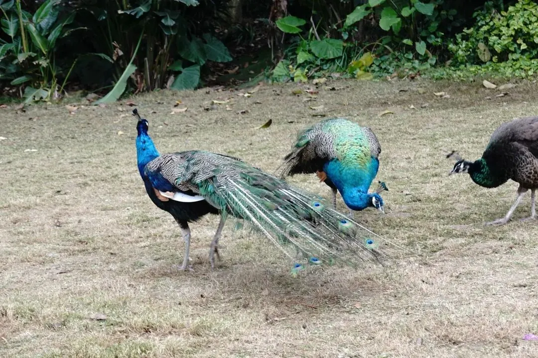 接着往前走,有一大片草坪,有孔雀闲庭散步,游人跟着拍照,蓝孔雀多,白孔雀少,孔雀一边散步一边抖着脖子发出尖叫声,就是没有开屏的打算。