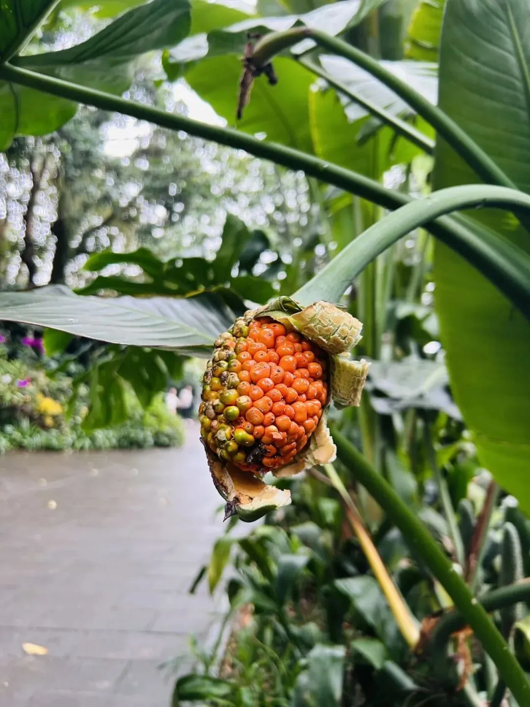 时间已近五点半,准备出园,一路上又看到了细叶朱蕉开着成串的密集小花,海芋结出的红色果实,还有开花的天堂鸟。