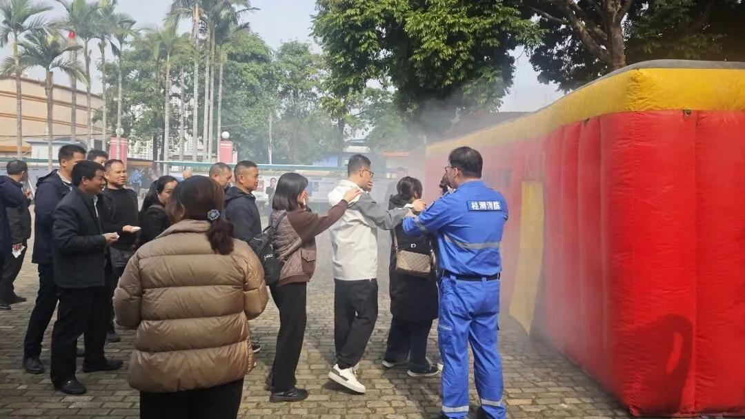 理论课程结束后,全体参训学员在广西桂澜消防职业培训学校老师们的带领下,分组轮流参与烟道模拟实景逃生演练。