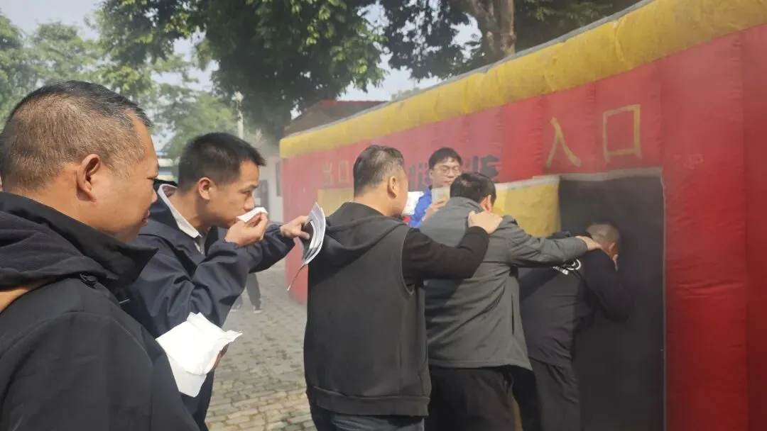 参训学员依次进入模拟火灾场景的“火灾逃生屋”,用湿毛巾捂住口鼻,压低身姿快速安全撤离,深刻体验在火灾的浓烟密布中如何进行逃生自救。