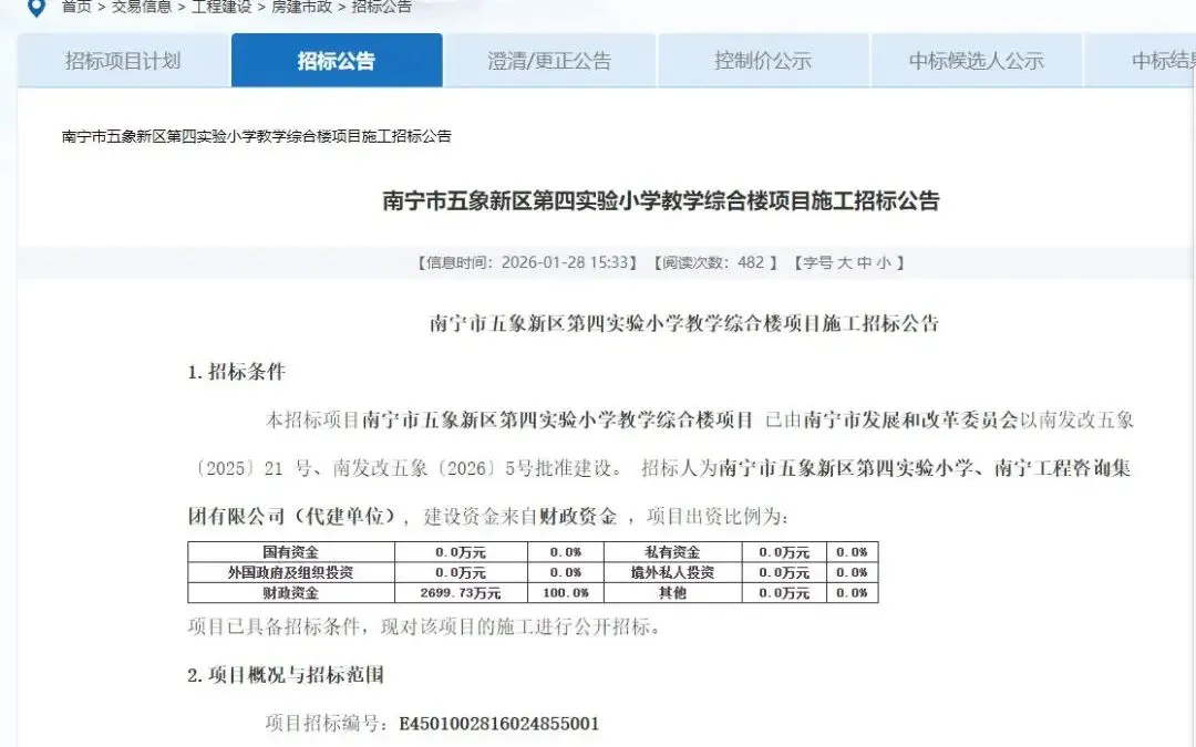 2026年1月12日,南宁市教育局直属名校五象实验四小改扩建项目正式发布招标公告,总投资超2170万元的教育升级工程,扩建后五象片区的教育学位得到缓解。