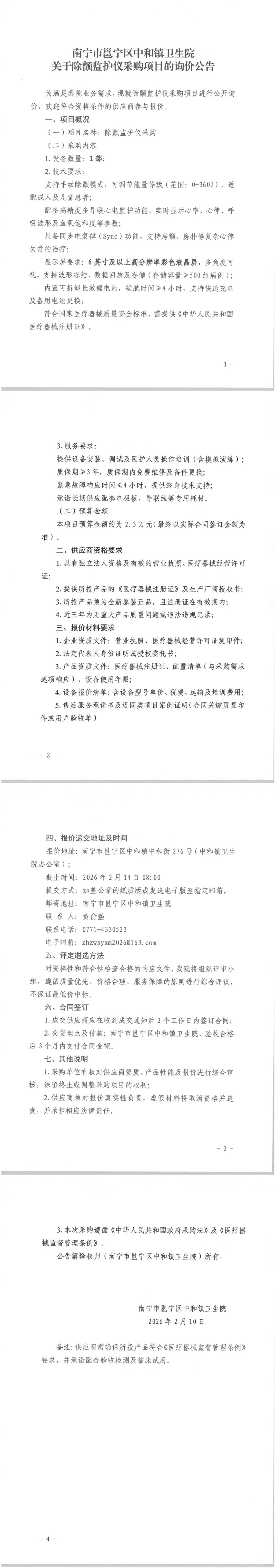 >南宁市邕宁区中和镇卫生院关于除颤监护仪采购项目的询价公告