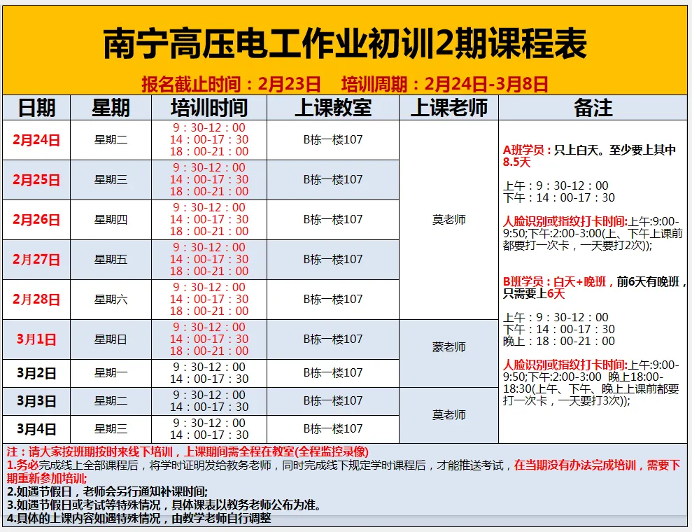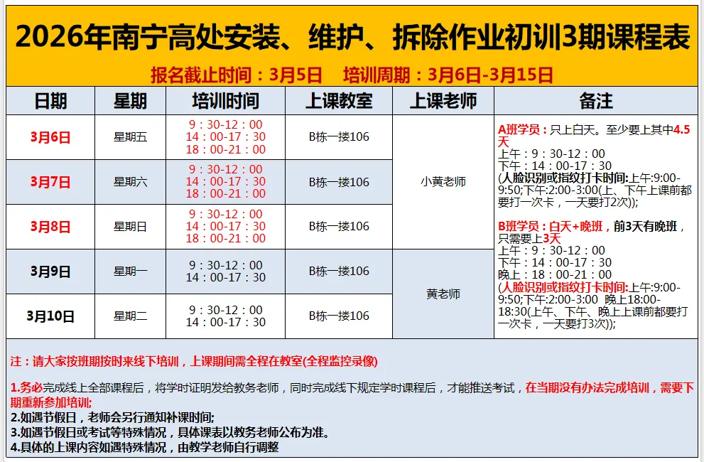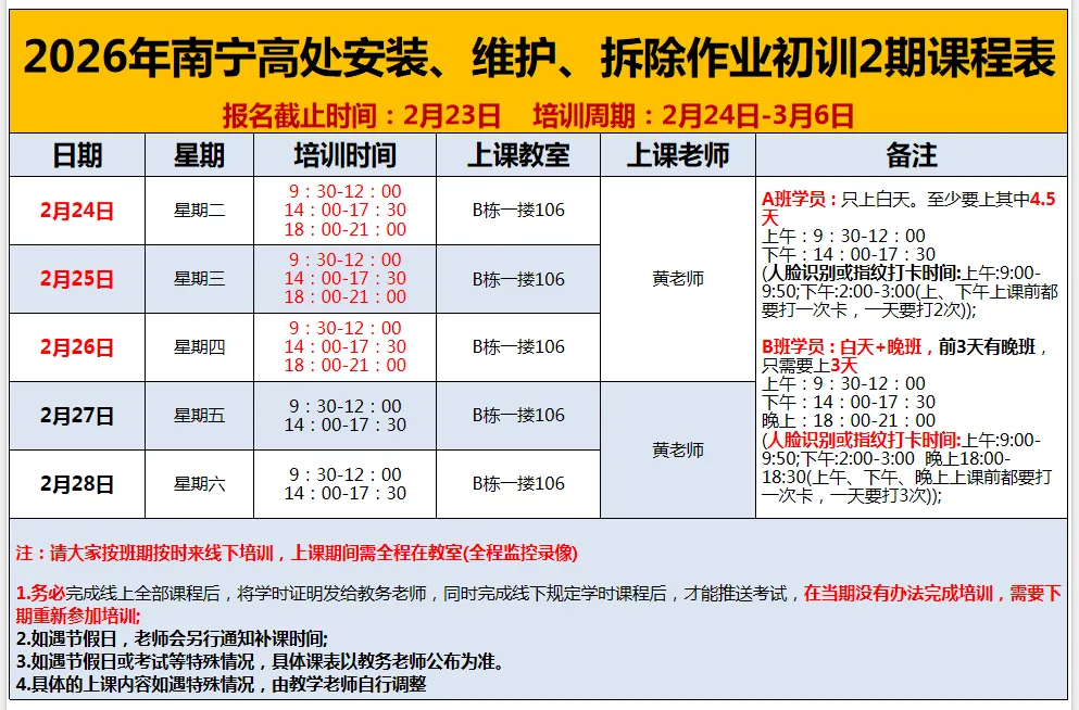 为响应国家关于加强特种作业人员安全技能培训的政策要求,满足广大社会人员提升职业技能、增强就业竞争力的需求,现面向社会开展低压电工作业、高压电工作业、熔化焊接与热切割作业、高处安装、维护、拆除作业操作证培训服务。持证上岗,合规就业,助你在职场中脱颖而出!报名流程:广西安全生产考试发证系统注册,由培训机构统一上报选班,上课当天再带身份证原件过来参加培训。线下培训:高压电工6天;低压电工5天;焊工3.5天,高处作业3天。考试时间:培训完成后由南宁市应急局考试中心安排考试时间,具体考试时间以考试中心最终安排为准,培训结束后请多关注手机短信通知。