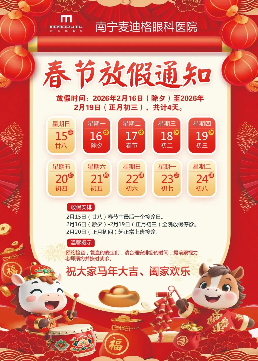 南宁华厦视光眼科医院2026年春节假期门诊工作安排