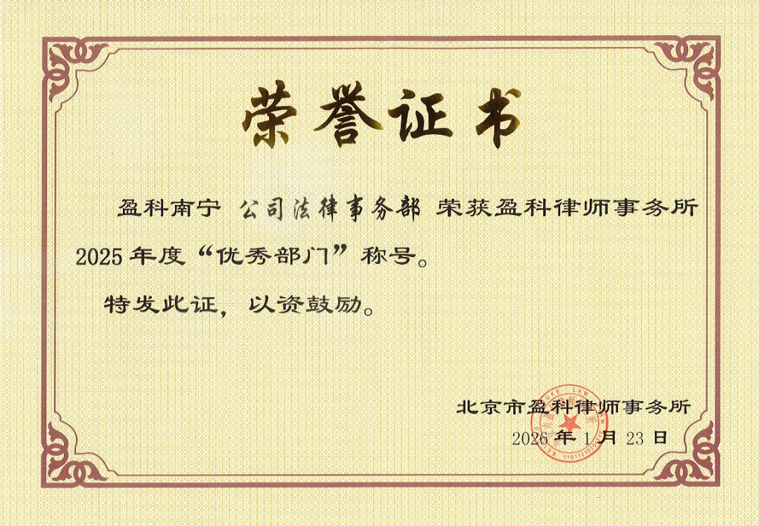 覃星魁律师荣获盈科律师事务所2025年度“盈科南宁优秀律师”称号。