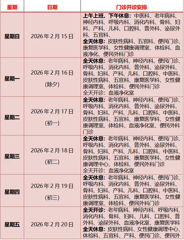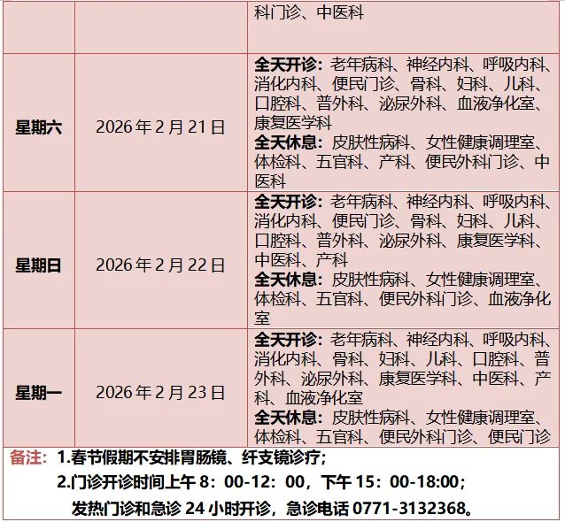 根据《广西壮族自治区人民政府办公厅转发国务院办公厅关于2026年部分节假日安排的通知》精神,结合医院工作实际,春节假期门急诊工作安排通知如下: