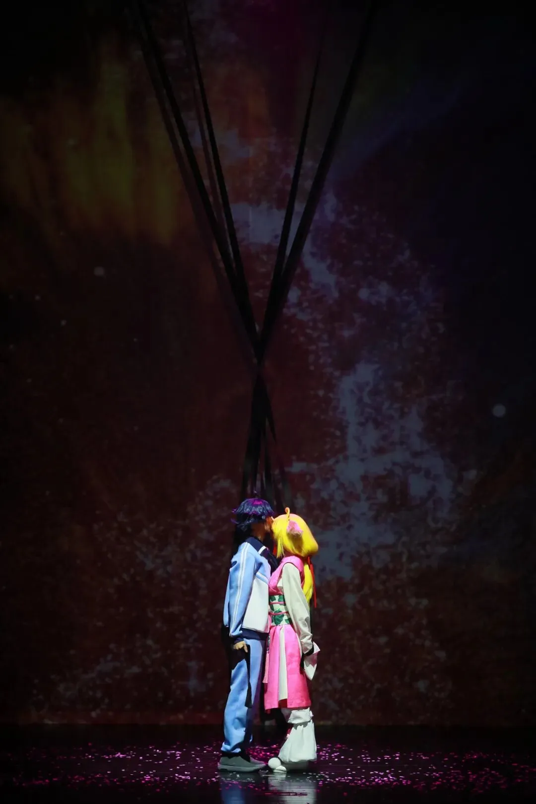 月红相拥洒满舞台的光影