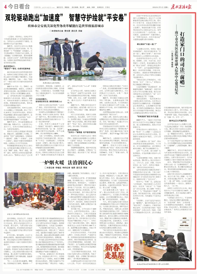法院自入驻综治中心以来,通过该平台共受理纠纷1160件,成功调解269件,其中司法确认159件,147件通过线上完成。“法院融入综治中心,不是物理搬迁,而是司法逻辑的重新梳理——从‘坐堂问案’转向‘主动治理’,从末端裁判走向前端疏导。我们播下的每一粒法治种子,都在降低社会的治理成本。”青秀区法院副院长刘春花说。