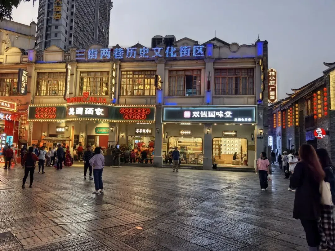 结束后回到三街两巷。“三街”是兴宁路、民生路、解放路,“两巷”是金狮巷和银狮巷。我建议先逛“两巷”,这边更有特色,小巷子很有味道,也有不少值得打卡的小店,可以顺手买点手信。一般晚上11点多关门,逛起来很舒服。