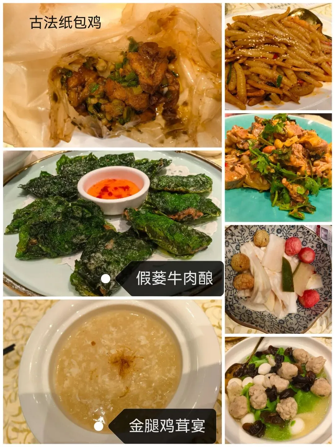 - 古法纸包鸡:这次吃到的纸包鸡味道不错,带点甜口,有点像广东的酱油鸡,但调味更丰富一些。是用香芹、葱、酱油、糖这些调料包在纸里焗的,和柠檬捞鸭的风味完全不同,但搭配在一起吃也不会互相抢味,都挺有特色。