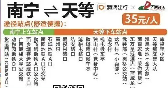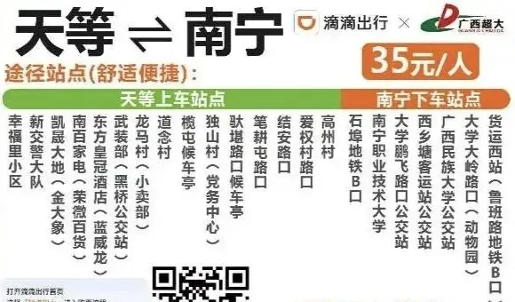 笔者近日了解到,为更好满足旅客出行需求,广西超大优化升级了“南宁⇋天等”滴滴站点巴士线路!2月11日起焕新回归,全程票价35元!