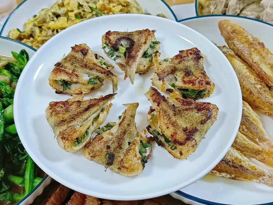 【奎龙鱼饼】这道菜相信沿海边的小伙伴都不会陌生,奎龙鱼买回来,对开鱼腹,用夹子把鱼刺拔出,用少许食盐抹匀鱼肉腌制,葱花切碎,包入鱼肉里面,香煎到金黄就可以享用了。香香嫩嫩,葱香四溢,特别好吃。