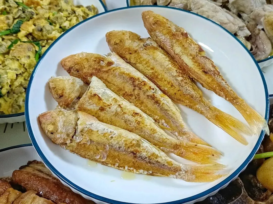 【香煎金丝鱼】金丝鱼洗净去掉内脏,用少许盐涂抹腌制片刻,晾干表面水分。热锅放油,放入金丝鱼煎到两面金黄即可出锅。