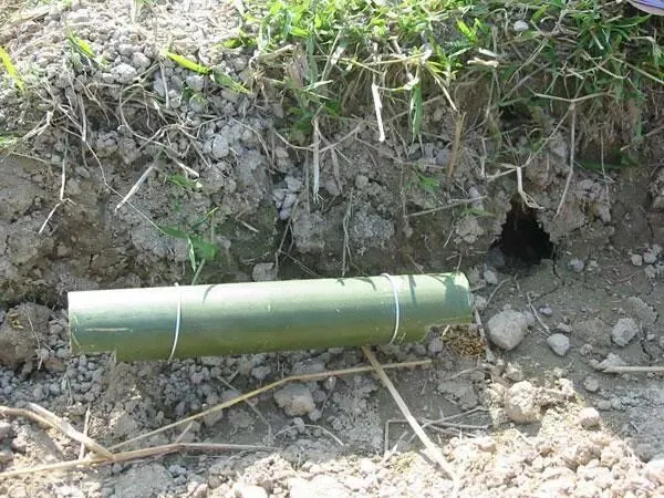 制作:取内径大于6厘米的竹子、PVC塑料管或硬质塑料瓶,锯成长60厘米的筒状,将内部打通,两端各保留5厘米的“耳朵”作为防雨檐,用铁丝绑住两头并将铁丝脚插入泥土中固定,毒饵站离地面约3厘米,防止雨水流入。