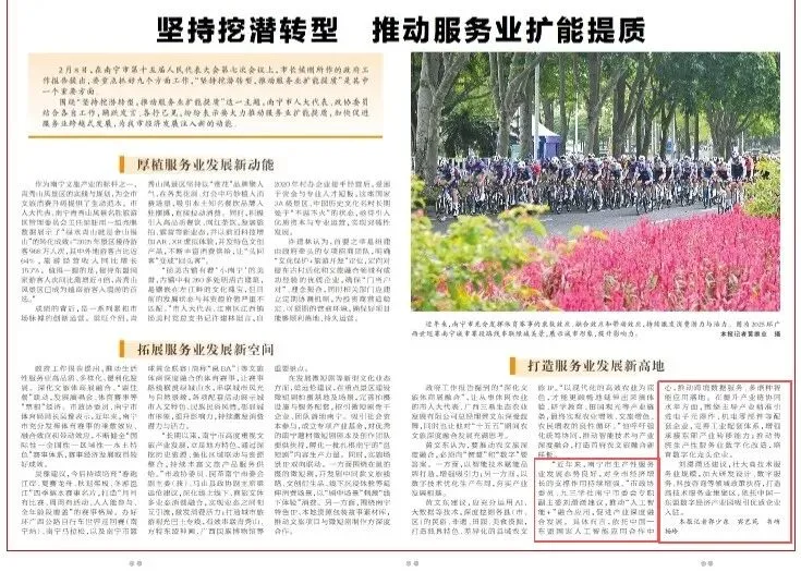 2月8日,在南宁市第十五届人民代表大会第七次会议上,市长侯刚所作的政府工作报告提出,要重点抓好九个方面工作,“坚持挖潜转型,推动服务业扩能提质”是其中一个重要方面。