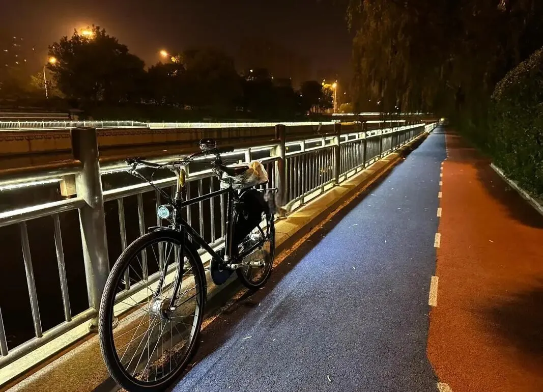 江滩夜骑带车灯,江边不下水,岸石滑,脚底要稳。